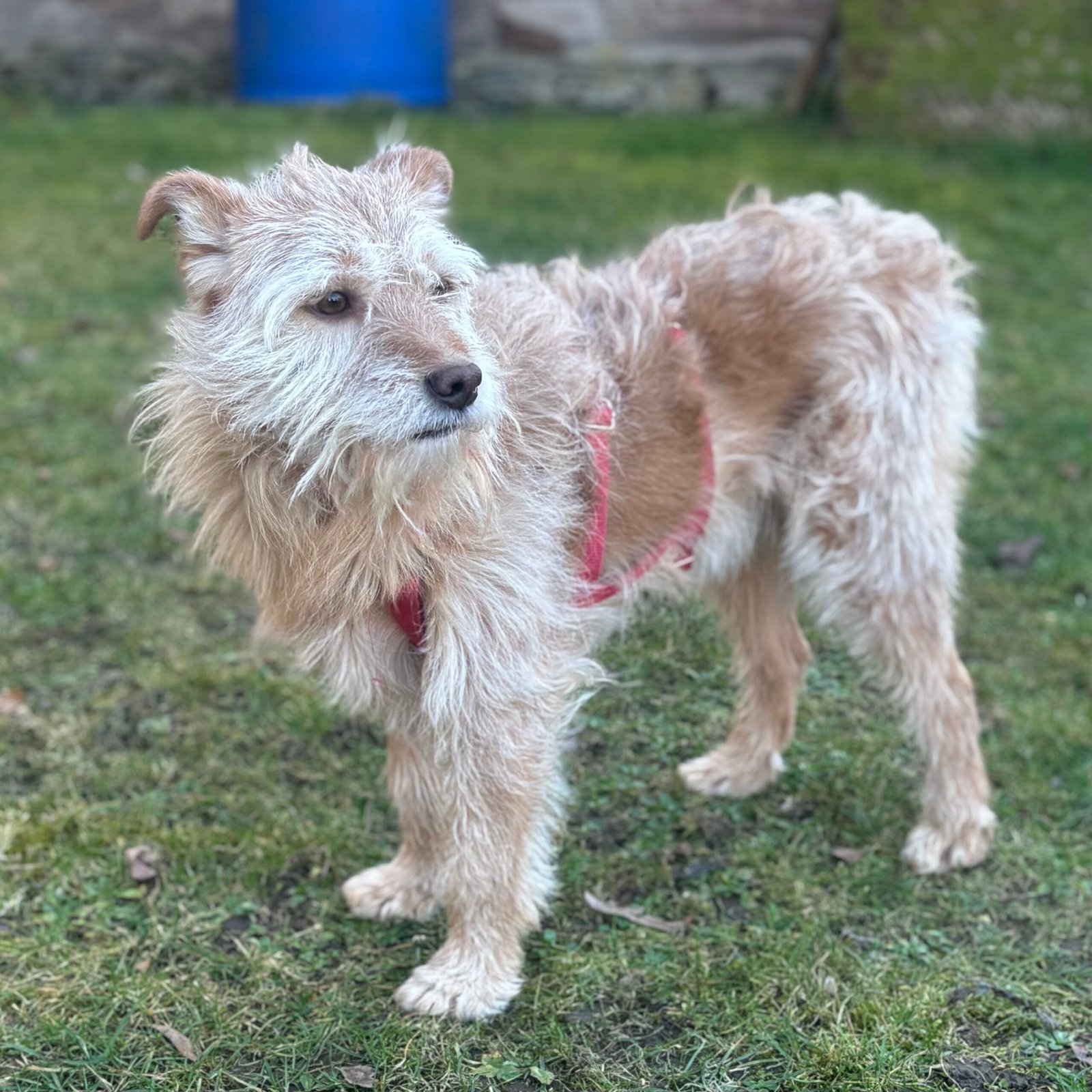 Teo hatte anfangs panische Angst vor Menschen. Doch mittlerweile ist er mit bekannten Menschen im Tierheim freundlich, lässt sich von ihnen streicheln und versucht sogar mit ihnen zu spielen. Es stellte sich heraus, dass Teo leider nichts hören kann. Das ist natürlich zusätzlich stark verunsichernd bei einem sowieso schon ängstlichen Hund.